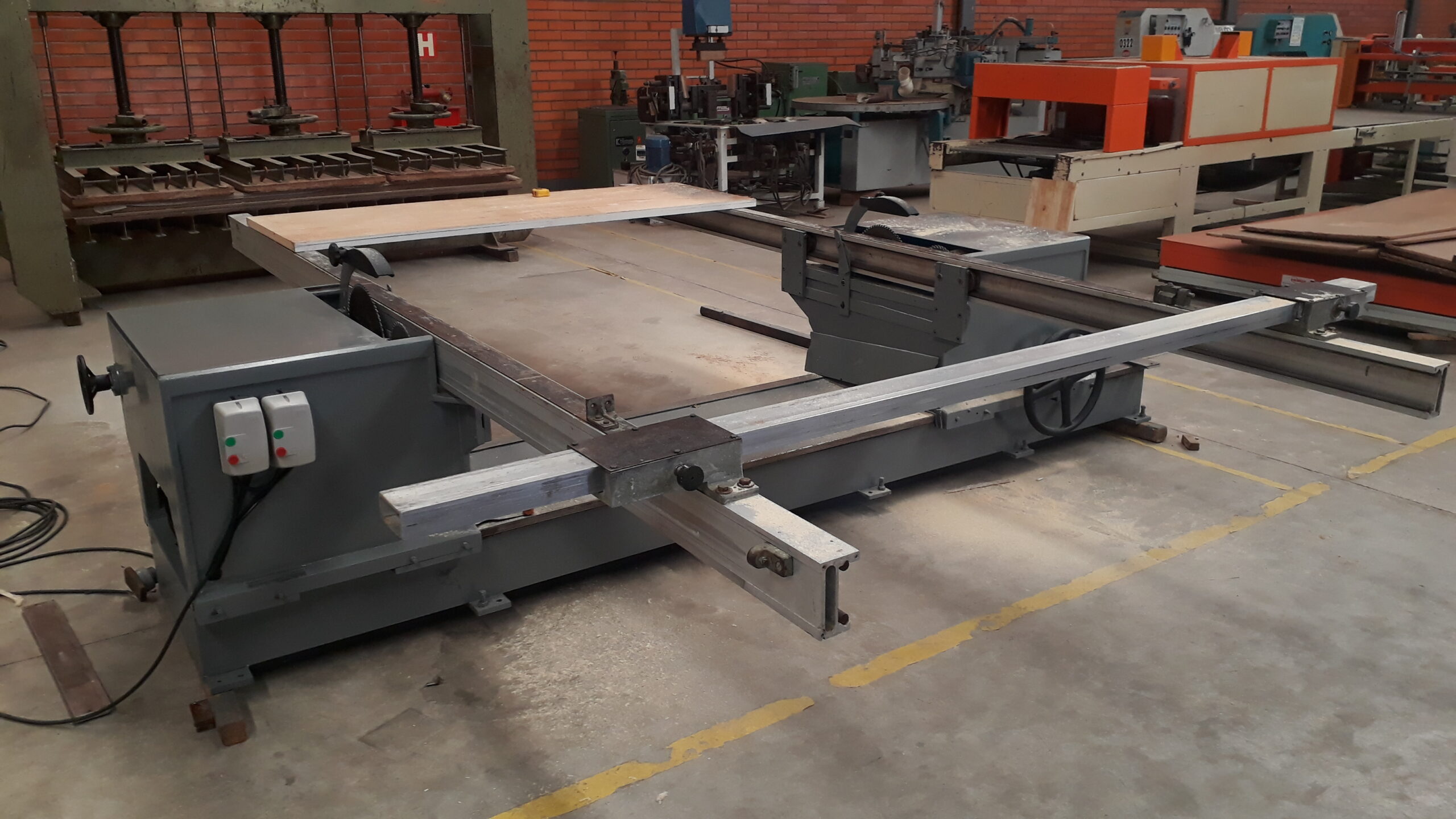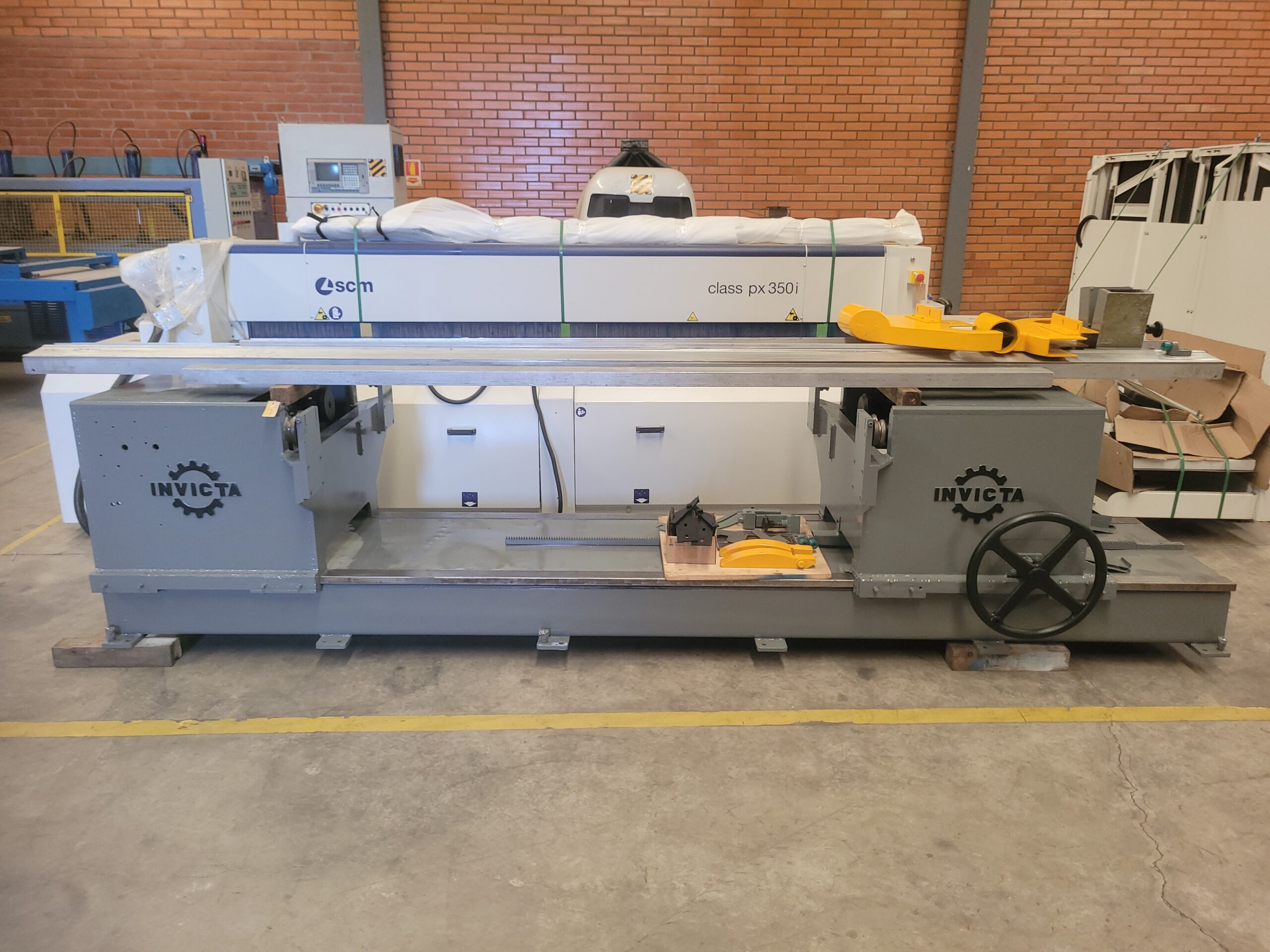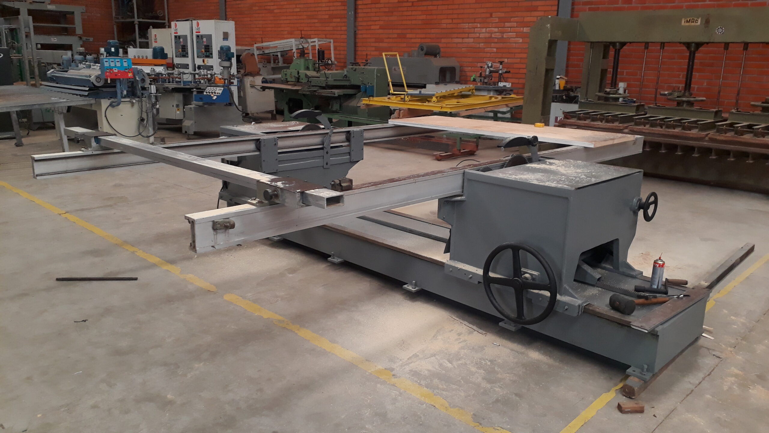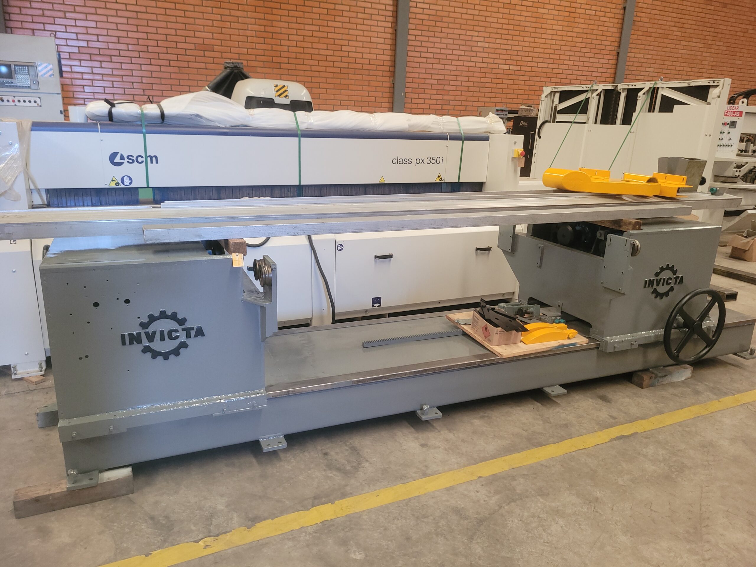 Esquadrejadeira Dupla marca Invicta modelo Tetra, corte de 2500 mm, com riscador e serra cada lado, conjuntos com possibilidade de inclinação até 45º, motores do riscador 1 cv e da serra 5 cv. Máquina reformada e pintada.