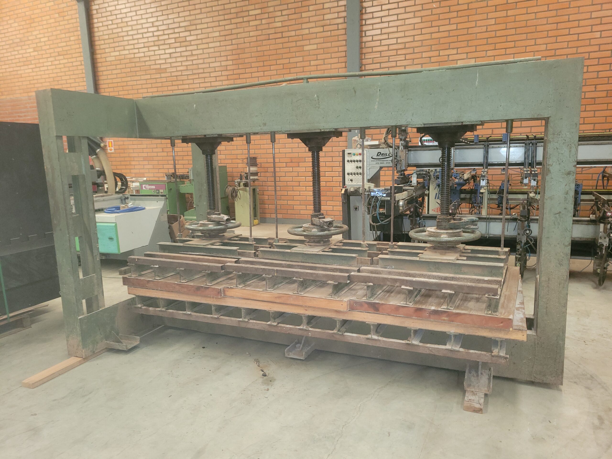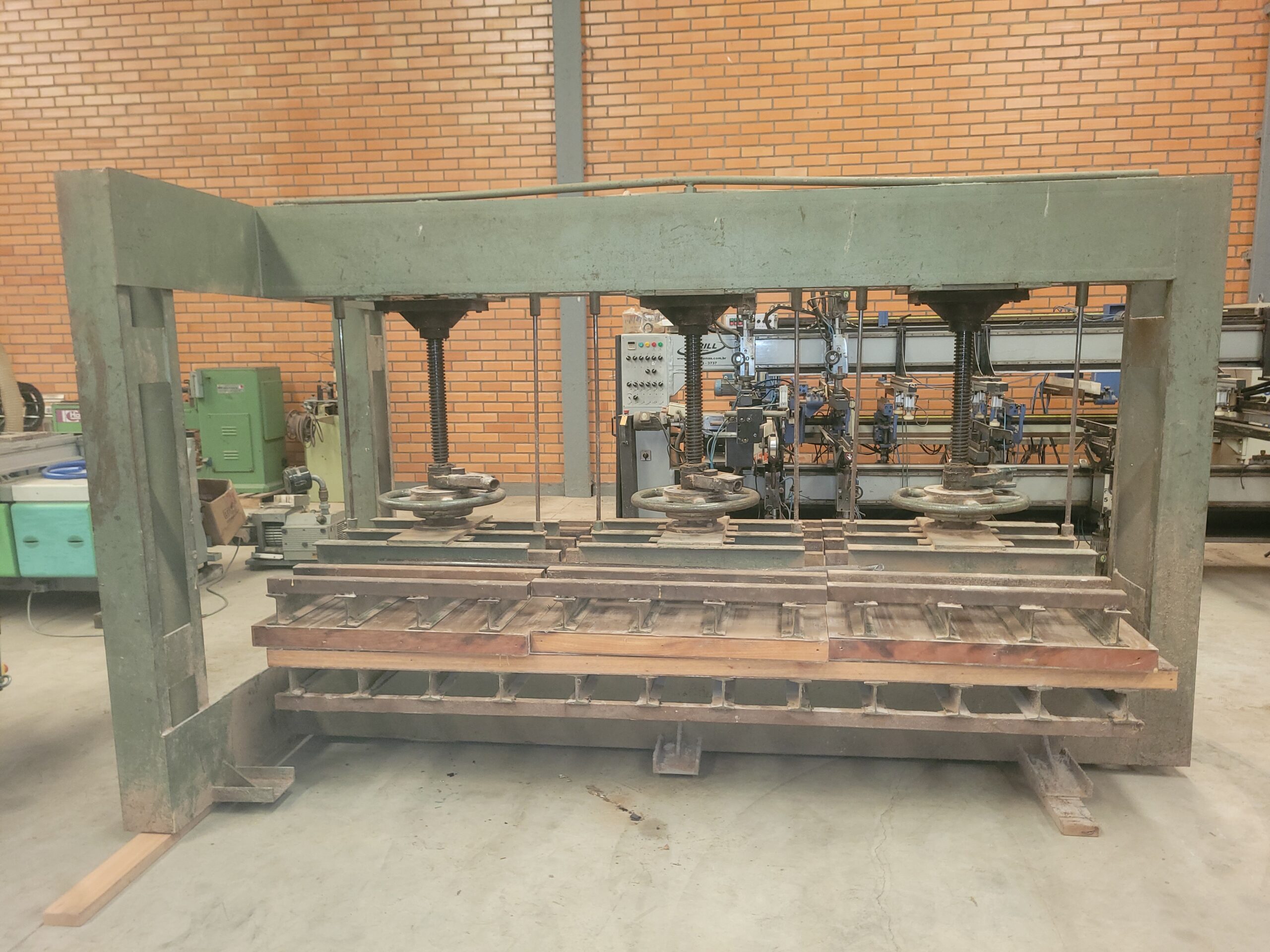 Prensa Manual marca Maksiwa com 03 Fusos, Prensagem de 3000 x 1200 mm.